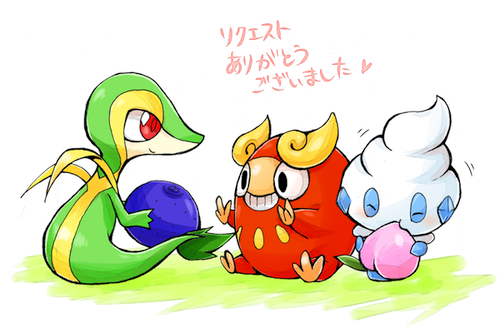 神田小宝さんのリクエストで「ツタージャ、ダルマッカ、バニプッチが一緒にいるところ」です~